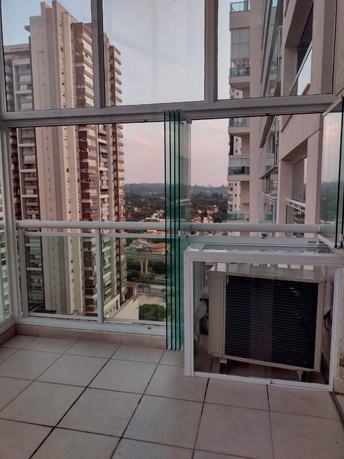 É possível segregar a eventual condensadora de ar-condicionado, inibindo o retorno do ar quente expelido e climatizando também a área da varanda, em conjunto com a sala.
